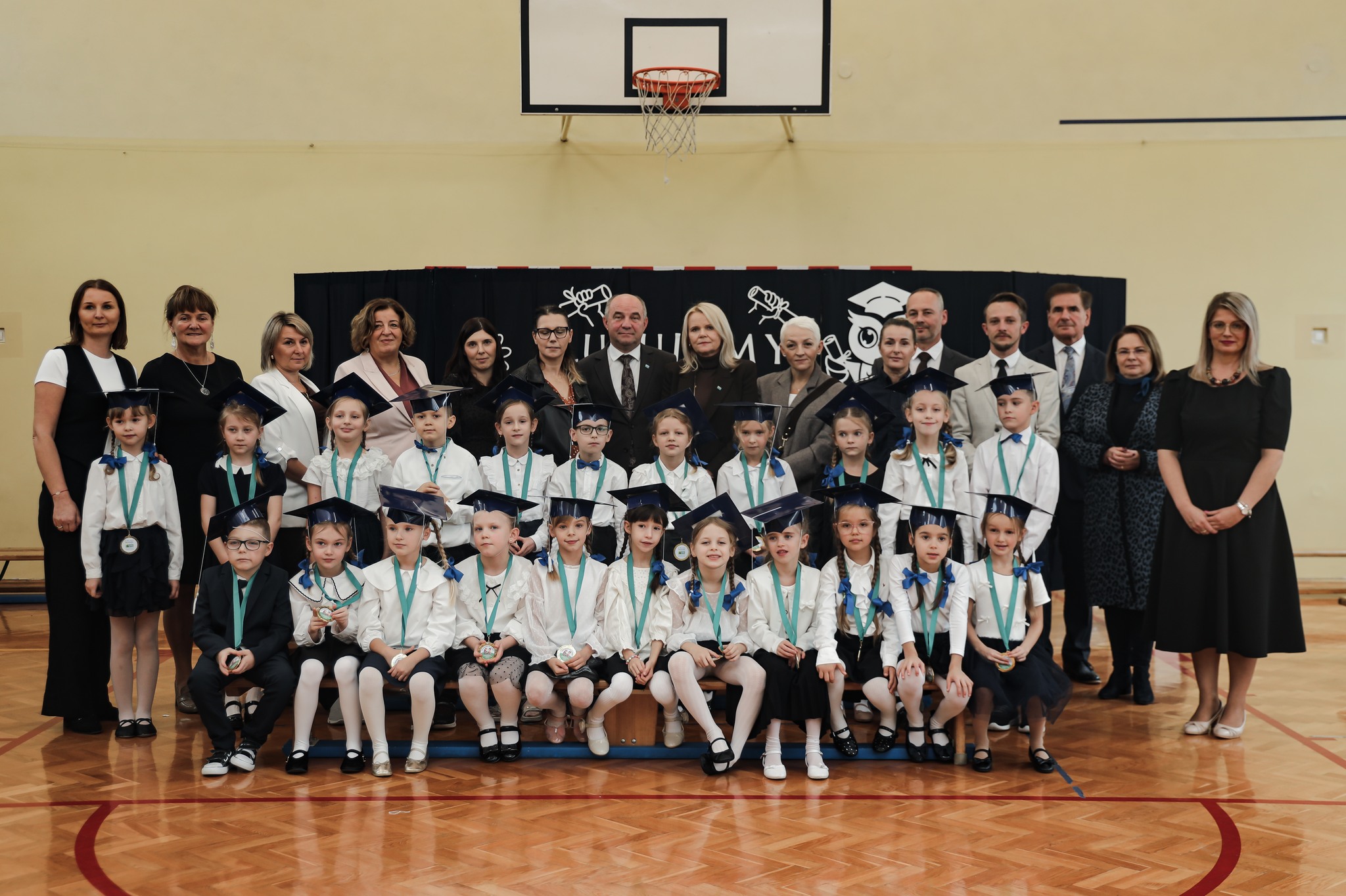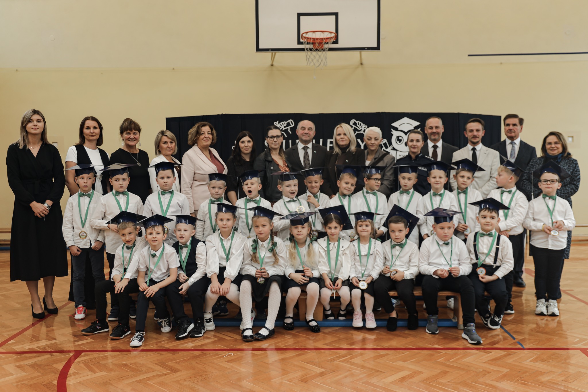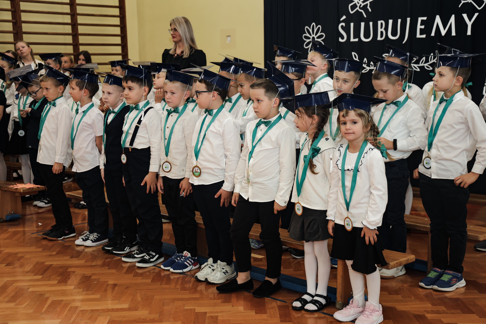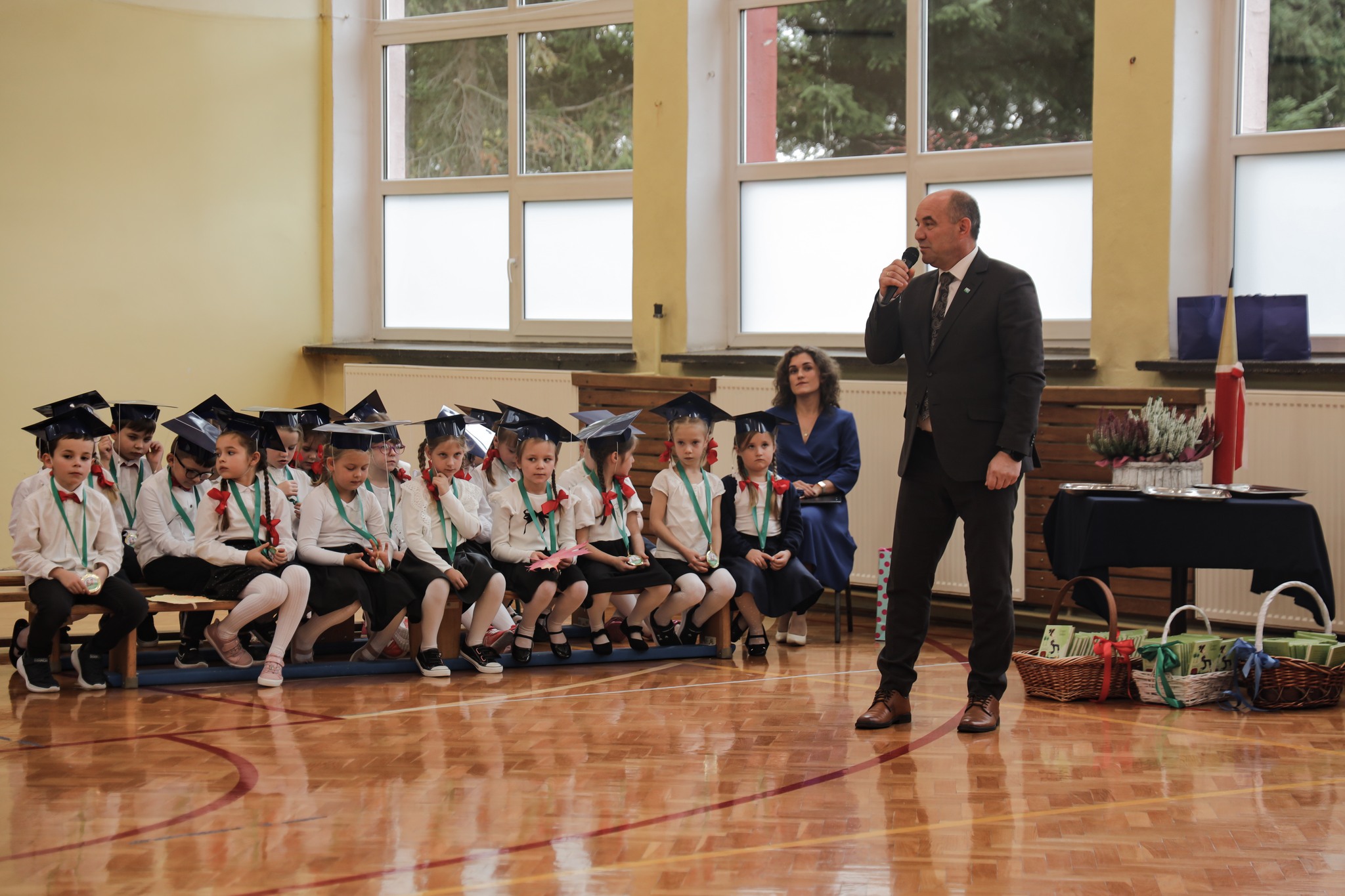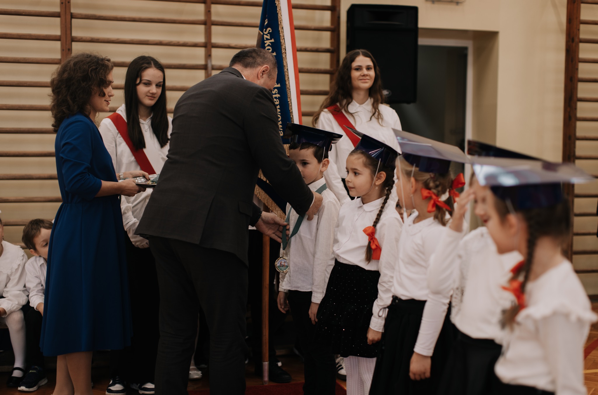 Drugoklasiści przywitali młodszych kolegów krótką inscenizacją. Pani Dyrektor Maria Kruczek dokonała uroczystego pasowania każdego ucznia, poprzez symboliczne dotknięcie ołówkiem lewego ramienia, a na zakończenie każdy pierwszak otrzymał pamiątkowy medal, wręczony przez Burmistrza Błażowej Jerzy Kocój, który był gościem honorowym wydarzenia. Dodatkowym, symbolicznym gestem było posadzenie przez każdą klasę swojego krzewu – jako znaku wzrostu, rozwoju i nowego początku. Dziękujemy wszystkim, którzy byli z nami tego dnia, a szczególnie zaproszonym gościom, którzy tak licznie odpowiedzieli na nasze zaproszenie.