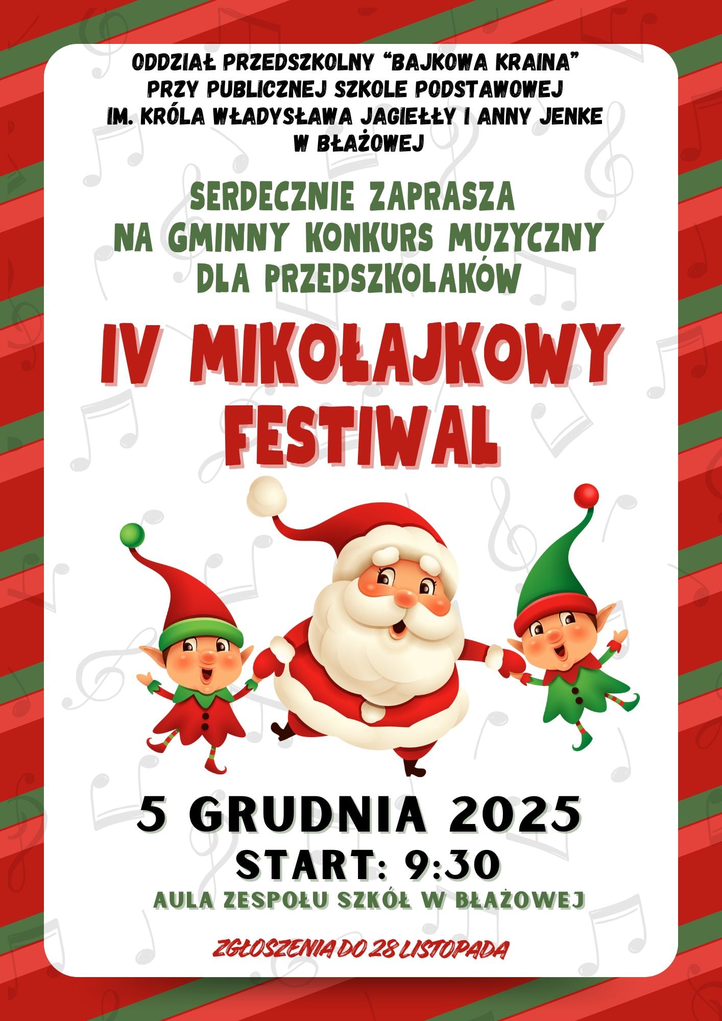 IV MIKOŁAJKOWY FESTIWAL By admin Published 2025-11-18 Artykuł Serdecznie zapraszamy do wzięcia udziału w gminnym konkursie muzycznym dla przedszkolaków. Regulamin udziału w konkursie >>> Karta zgłoszenia >>>