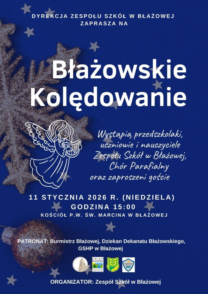 Dyrekcja Zespołu Szkół w Błażowej serdecznie zaprasza na „Błażowskie Kolędowanie”. Wystąpią przedszkolaki, uczniowie i nauczyciele, Chór Parafialny oraz zaproszeni goście. Koncert odbędzie się 11 stycznia 2026 roku o godzinie 15:00 w kościele parafialnym w Błażowej.